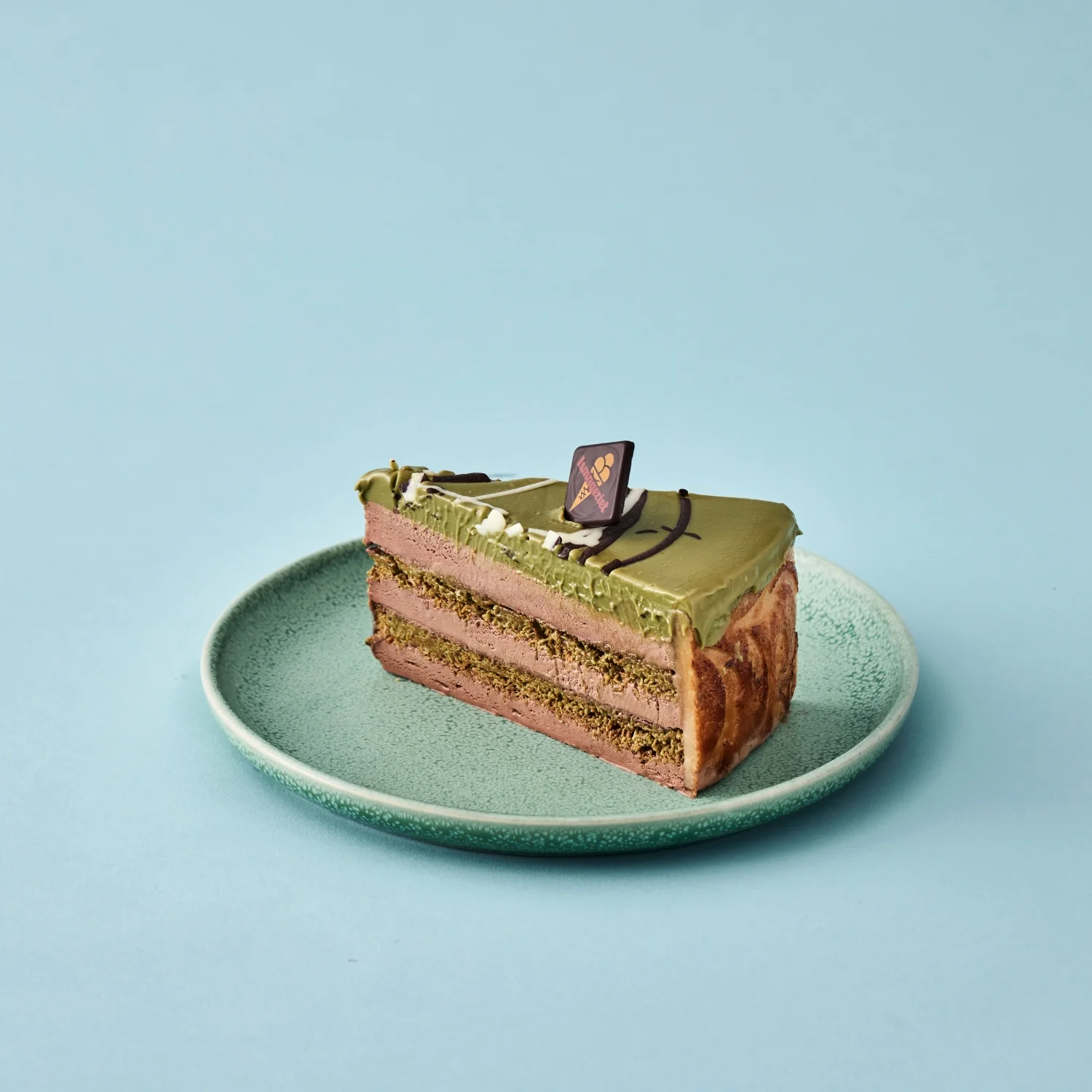 Lag af Mælkechokoladeis, mælkechokolade og sprød kadayif vendt i pistaciecreme, der er omkranset af marcipanbånd.