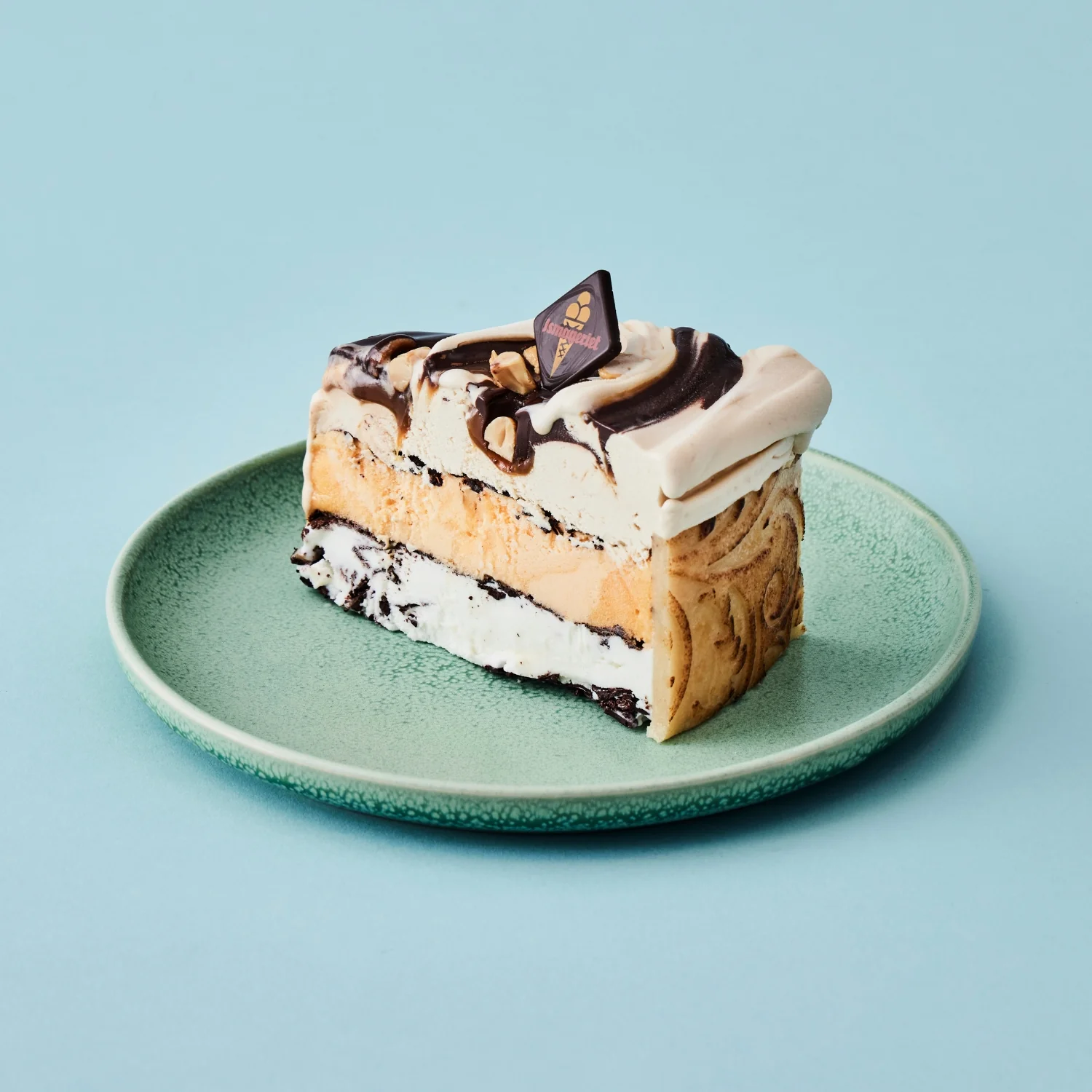 Ismageriets Favorit 7 består af en bund med stracciatella is, en midte med havtorn sorbet og et toplag af vores peanut-is med karamel og chokolade.